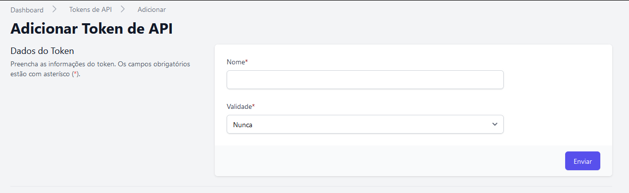 Defina um nome e se necessário uma validade para o Token e clique em Enviar.