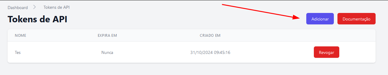 Uma lista com os Tokens já criados será exibida. Clique em Adicionar no canto superior direito.
