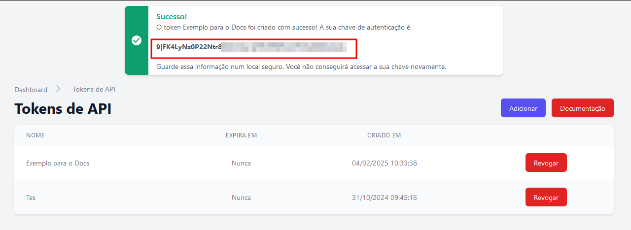 Você será redirecionado para a listagem de Tokens com um aviso contendo seu Token. Atenção: Nunca compartilhe esse token com ninguém! Copie em um lugar seguro! Esse código não aparecerá em lugar nenhum nunca mais, caso o perca será necessário criar um novo.