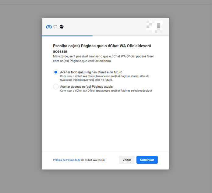 - Você será redirecionado para entrar com o seu perfil que criou no Gerenciador de Negócios e poderá selecionar quais páginas criadas você permite que o dChat tenha acesso. Após escolher uma opção, selecione "Continuar"