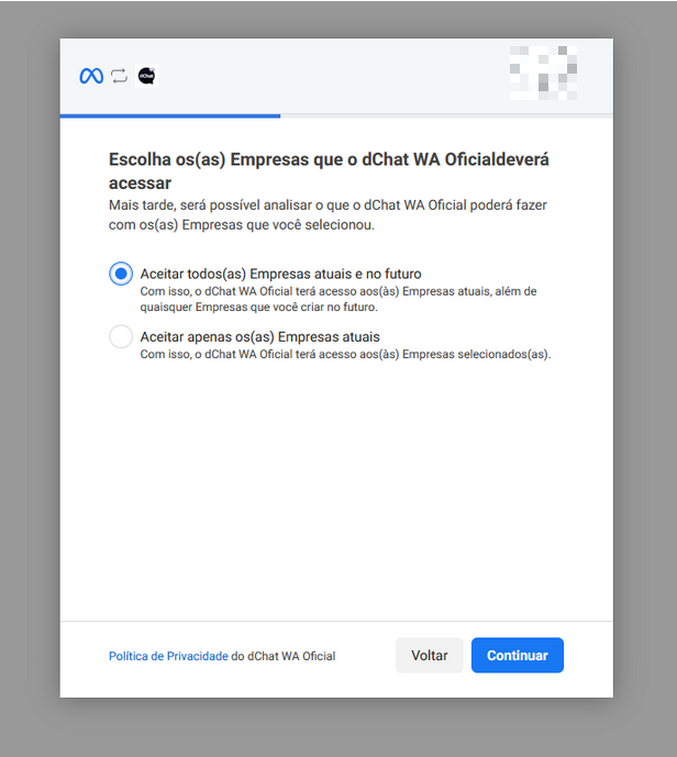 Nesta etapa você poderá selecionar quais empresas (que você cadastrou anteriormente como portfólio empresarial) você irá permitir que o dChat tenha acesso. Após escolher uma opção, selecione "Continuar"