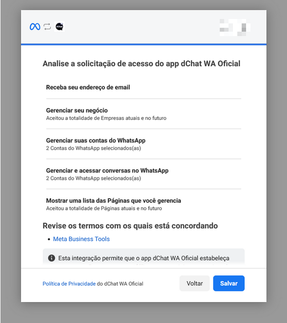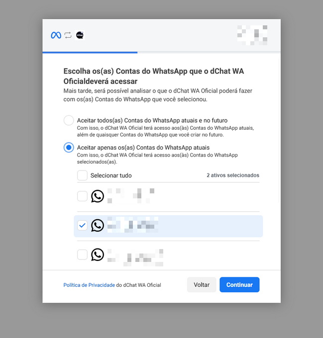 - A seguir você poderá escolher quais contas WhatsApp (que você cadastrou anteriormente na sua empresa) você irá permitir que o dChat tenha acesso. Após escolher uma opção, selecione "Continuar"