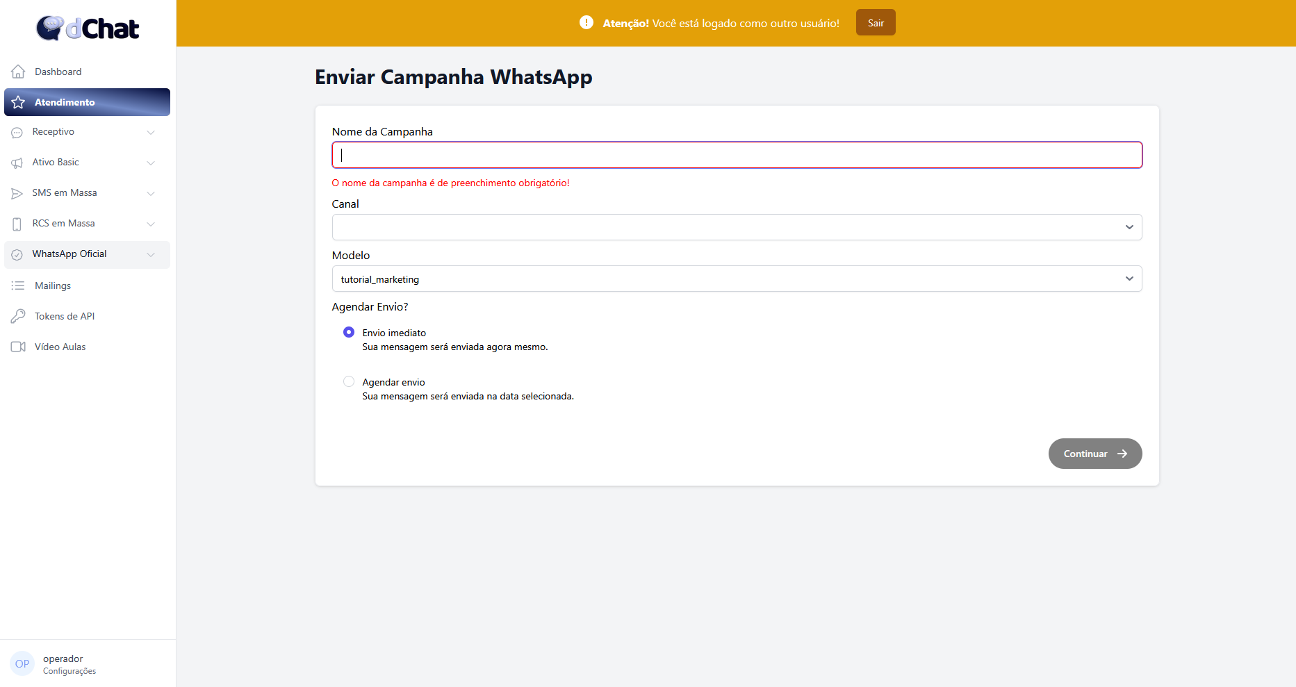 Para criar uma nova campanha basta selecionar "Nova Campanha" no canto superior direito da tela ou acessar pelo menu lateral esquerdo a aba "Nova Campanha" em "WhatsApp Oficial" - Na página de criação da campanha, você poderá escolher o nome da sua campanha, selecionar o canal cadastrado anteriormente, definir qual modelo deseja utilizar (se a campanha for criada a partir de um modelo, essa opção já vem preenchida) e decidir entre envio imediato ou agendado. Após preencher selecione "Continuar"