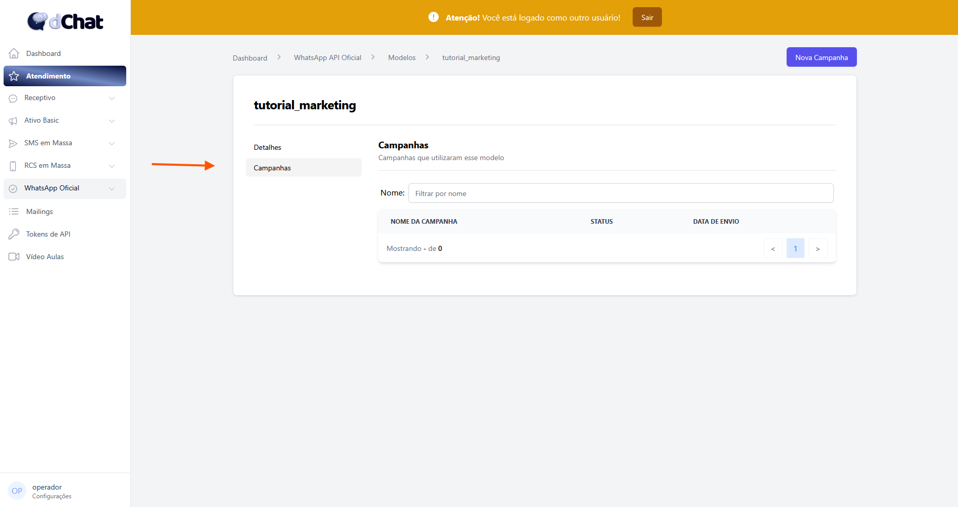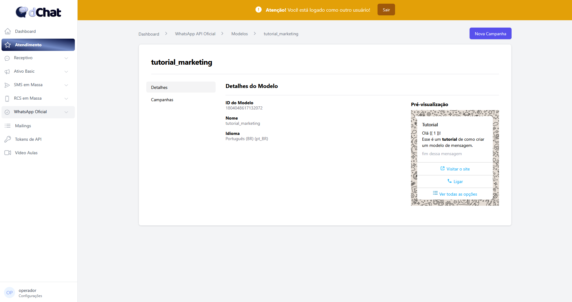 Você será redirecionado para a página de detalhes do seu modelo, onde estão as informações gerais do seu modelo e uma lista de todas as campanhas enviadas com ele na aba "Campanhas".