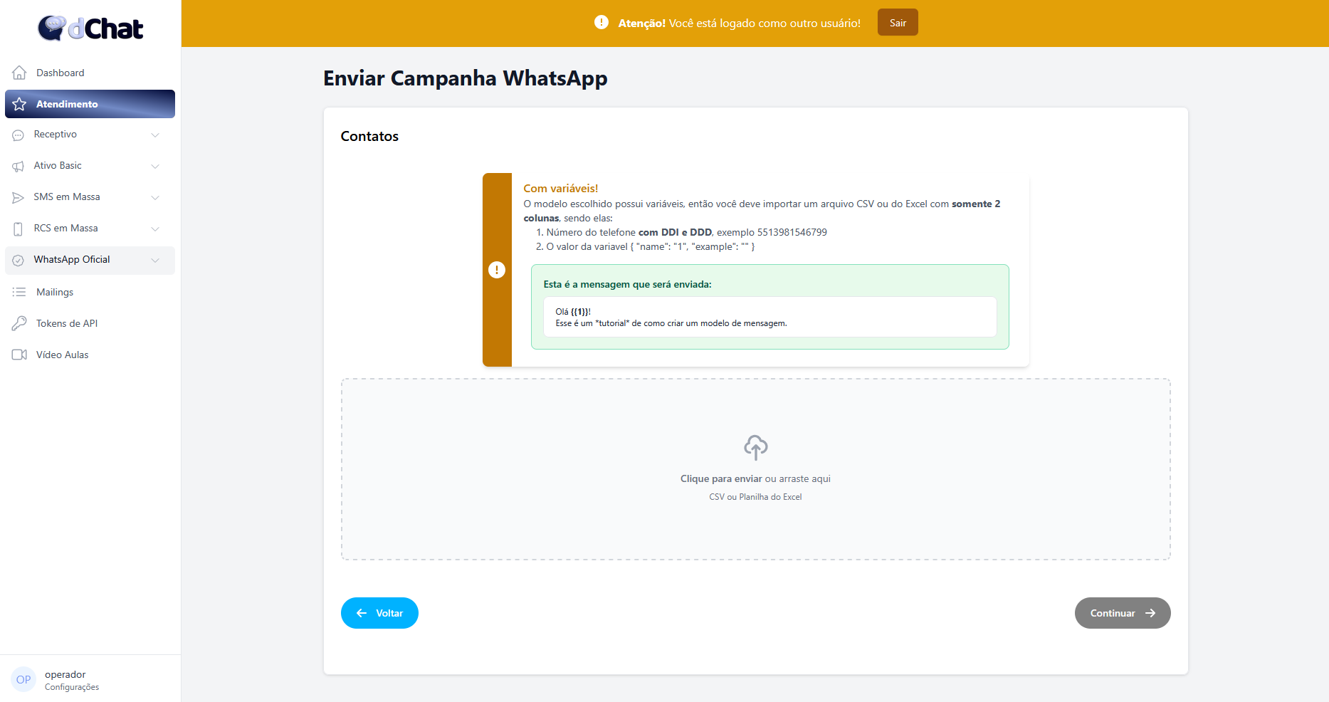 - Agora você será redirecionado para a página mais importante, fazer o upload da lista de contatos para qual sua campanha será enviada, como colocamos uma variável no nosso texto precisamos nos atentar a isso.