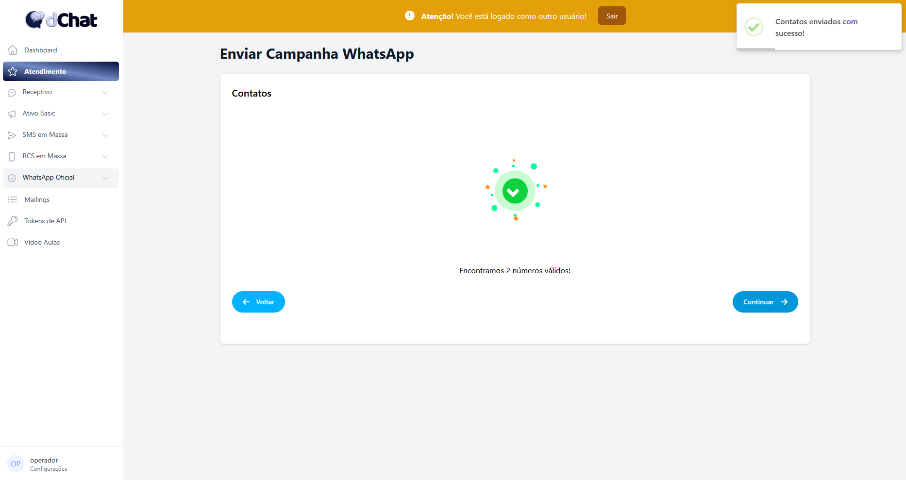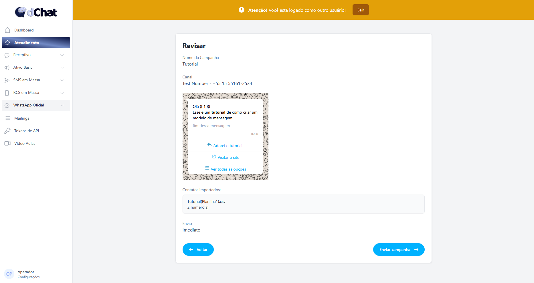 Agora importe na área de upload esse arquivo CSV e selecione "Continuar" para o passo seguinte. - Confira se todas as informações correspondem e selecione "Enviar Campanha" para iniciar seu envio