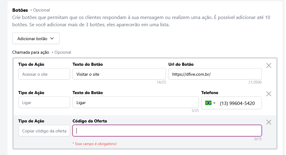 Esse campo te permite escolher quais tipos de ação seu cliente poderá realizar após ler sua mensagem, um modelo de mensagens pode ter os seguintes tipos de botão: