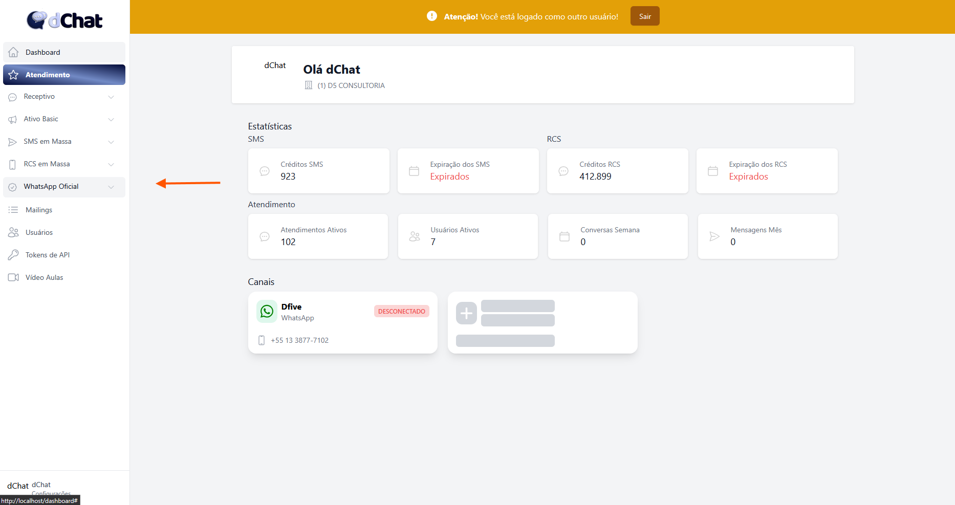 - Na sua tela inicial, acesse no menu lateral esquerdo a opção "WhatsApp Oficial"