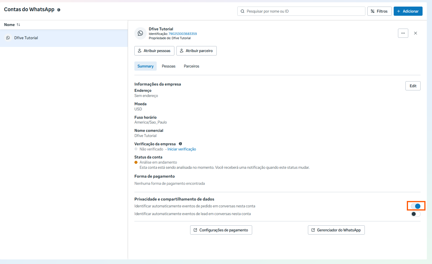 Se quiser ativar a identificação automática de pedidos ou leads em conversas na sua conta basta selecionar na lateral direita o botão de alternância - Para mudar ou inserir suas configurações de pagamento você pode selecionar o botão "Edit" ou selecionar o botão "Configurações de pagamento" que você será redirecionado.
