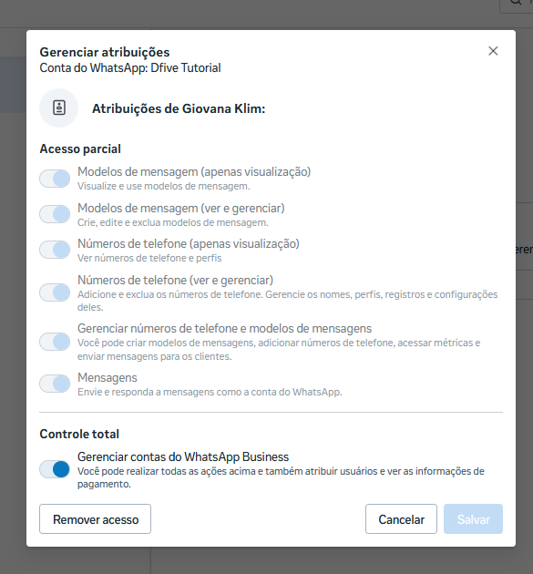Você poderá selecionar a pessoa que deseja adicionar e as permissões de acesso que ela terá. Após adicionar uma nova pessoa ela estará listada na opção "Pessoas" do menu.Aqui você poderá remover pessoas da sua conta, ir para a página de gerenciamento de pessoas ou gerenciar as permissões que a pessoa possui.