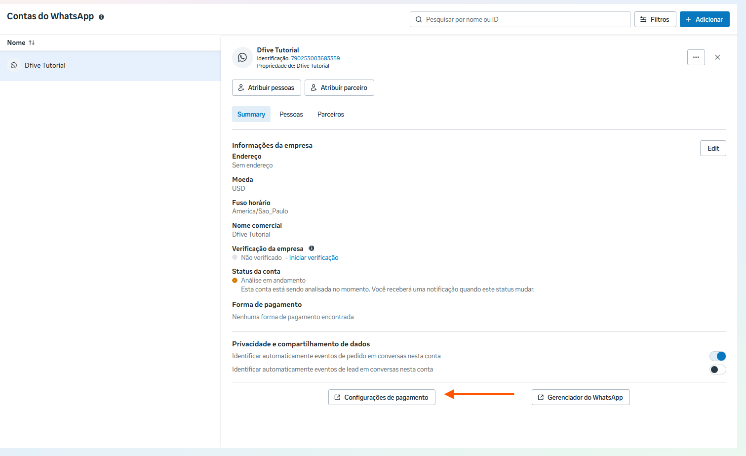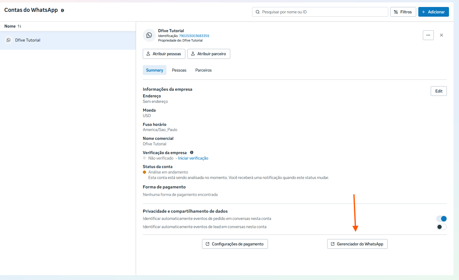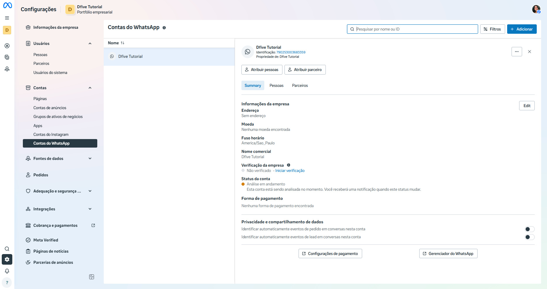 - Aqui constam algumas informações da empresa e da conta WhatsApp que você criou;