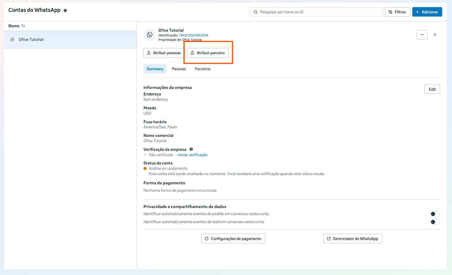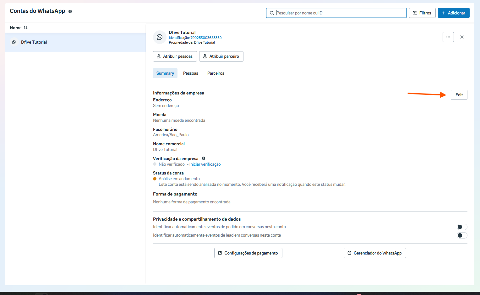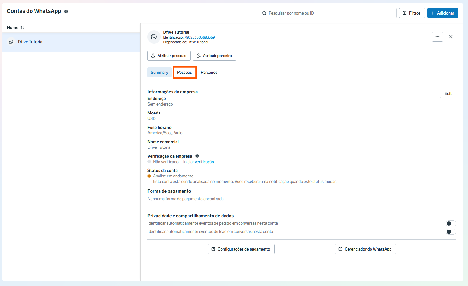 - Aqui constam algumas informações da empresa e da conta WhatsApp que você criou;