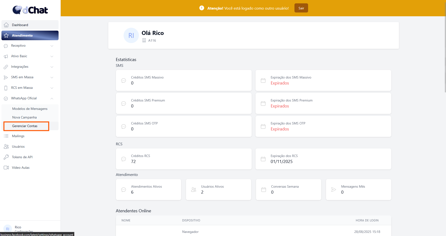 - Acesse o "Dashboard" em nossa plataforma dChat e no menu lateral procure por "WhatsApp Oficial" e "Gerenciar Contas" que você será redirecionado para o Gerenciador de Negócios do Facebook, na página de configurações da sua empresa.