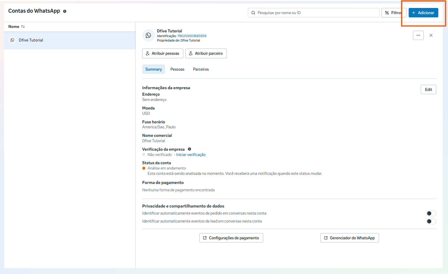- E por fim você poderá adicionar mais uma conta WhatsApp a sua empresa ao selecionar a opção "Adicionar"