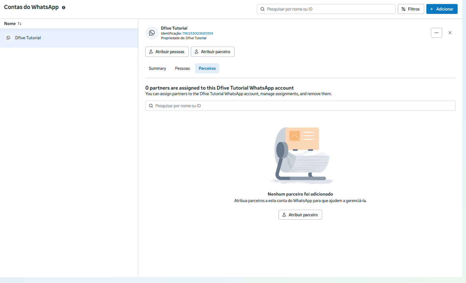- Você poderá adicionar empresas parceiras a sua conta selecionando o botão "Atribuir parceiros" localizado abaixo das informações da empresa